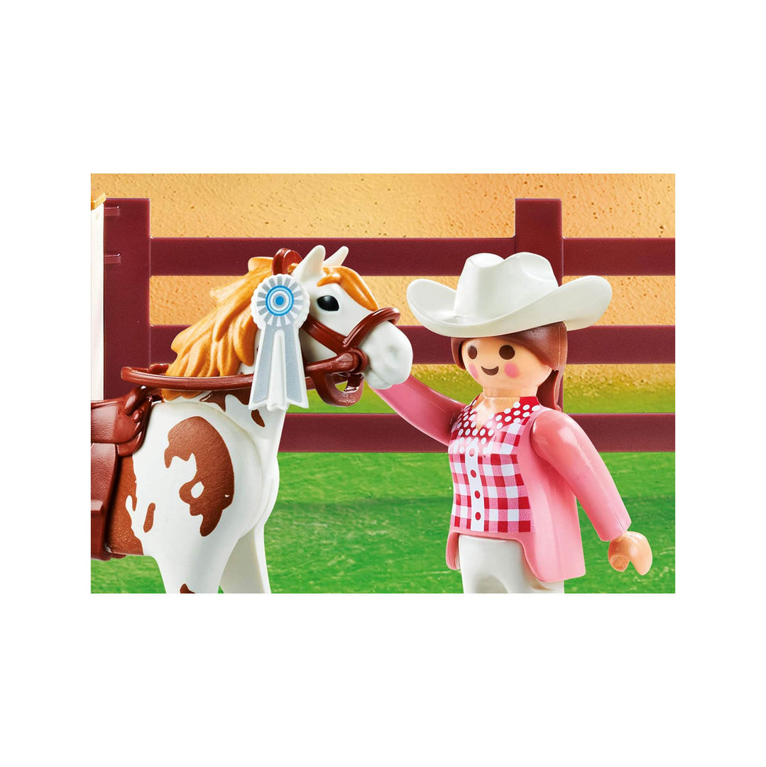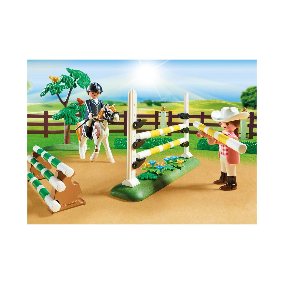 Playmobil 70337 Gran torneo ecuestre con cuatro figuras, tres caballos, establo, podio, obstáculos y muchos complementos.