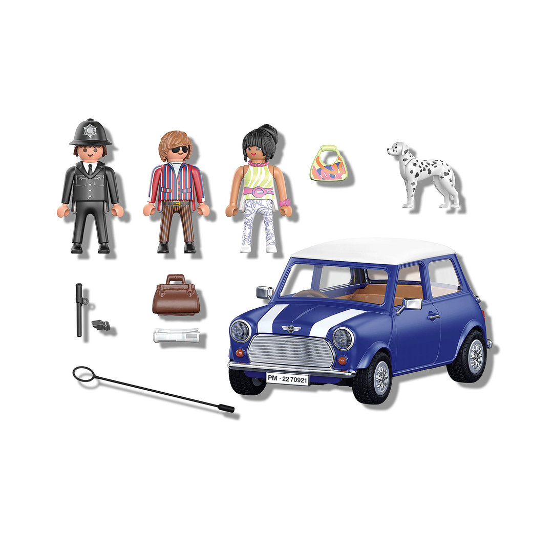 Playmobil 70921 Mini Cooper, el clásico de Gran Bretaña con figuras y accesorios de una escena londinense de los años 70.