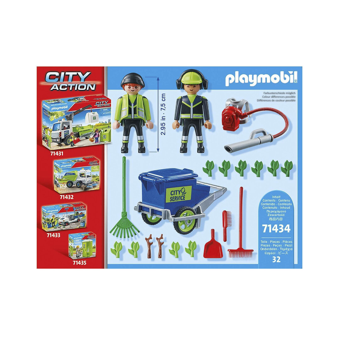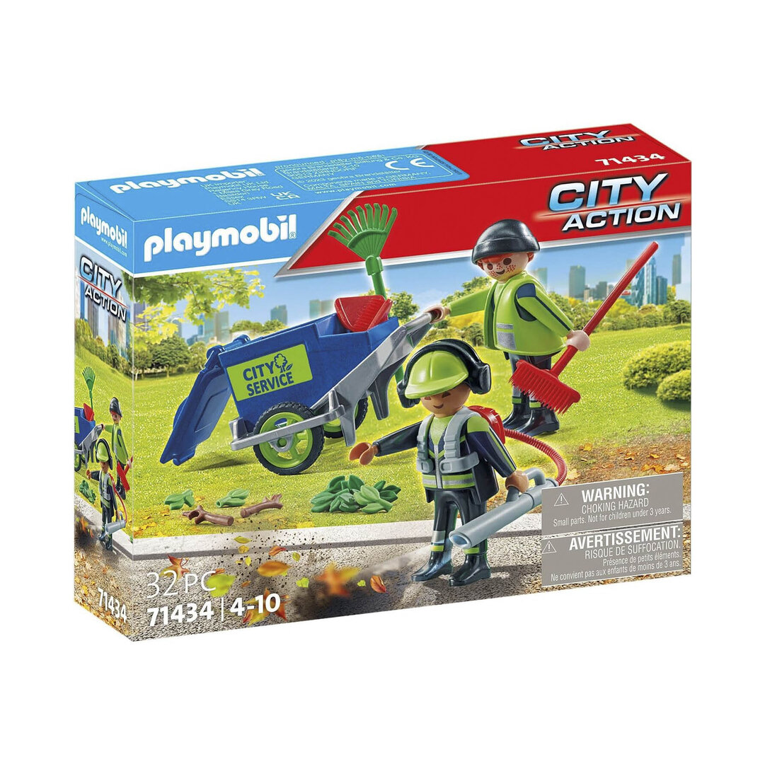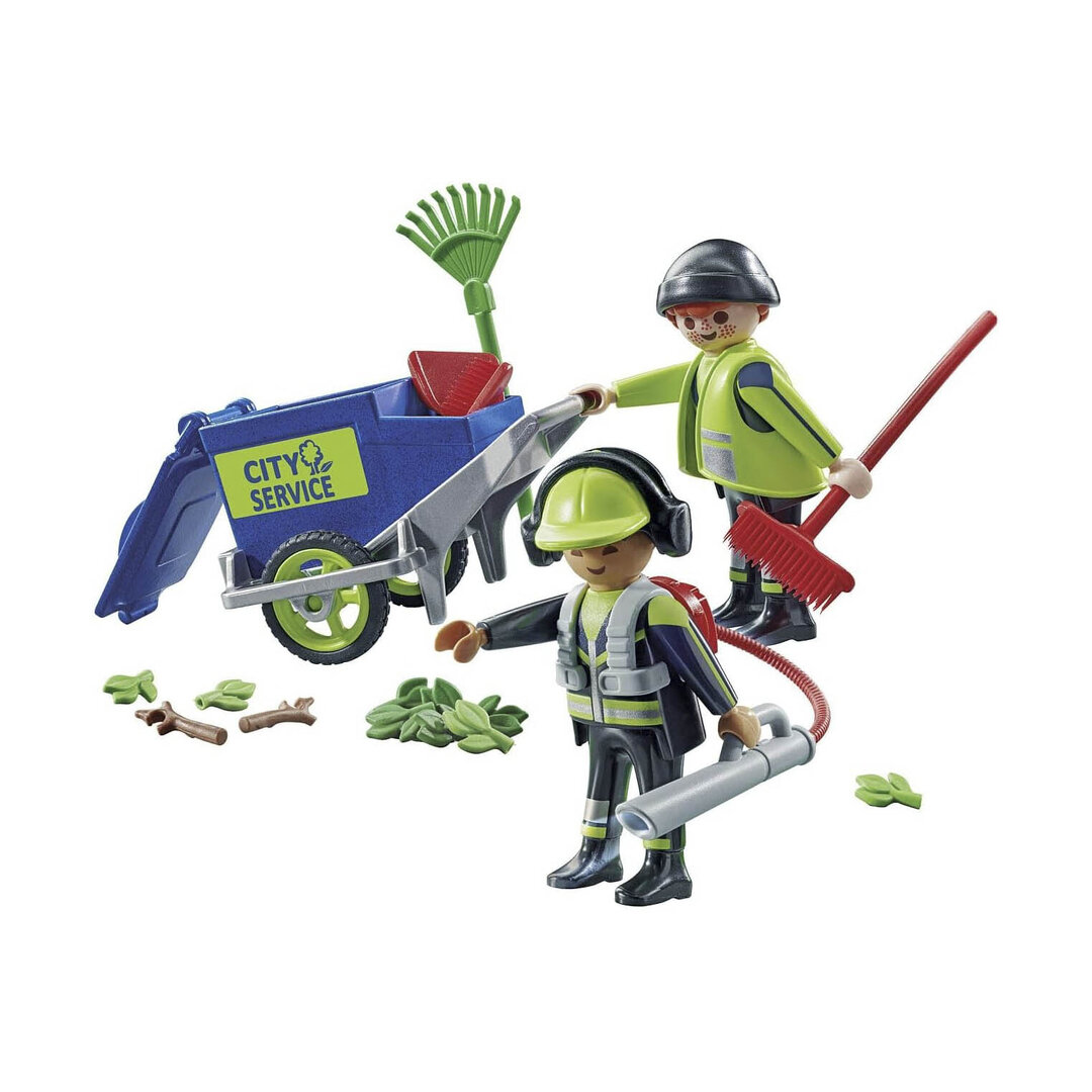 Playmobil 71434 Equipo de limpieza urbana. Dos barrenderos con su carro, escoba, soplador y muchas hojas por recoger.