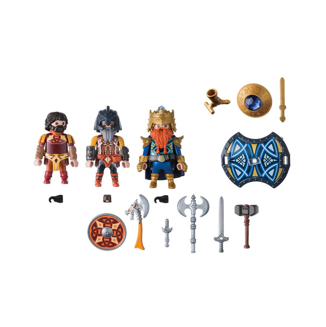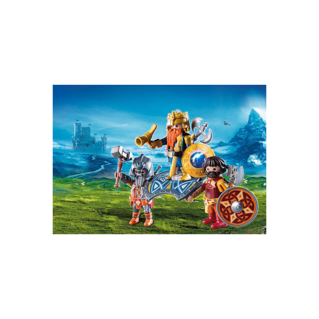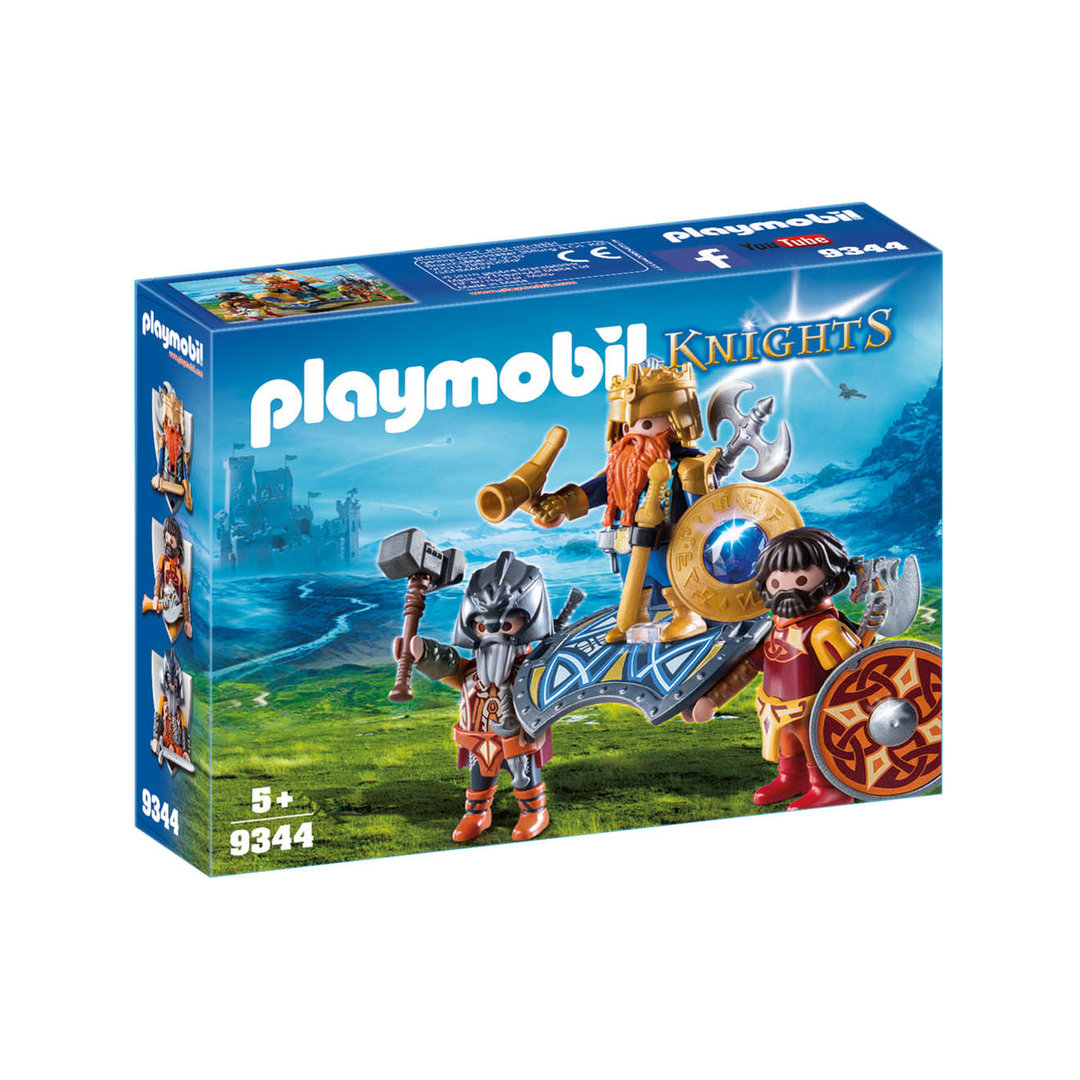 Playmobil 9344 Rey de los enanos. Un rey enano llevado sobre un escudo real por dos guerreros enanos.