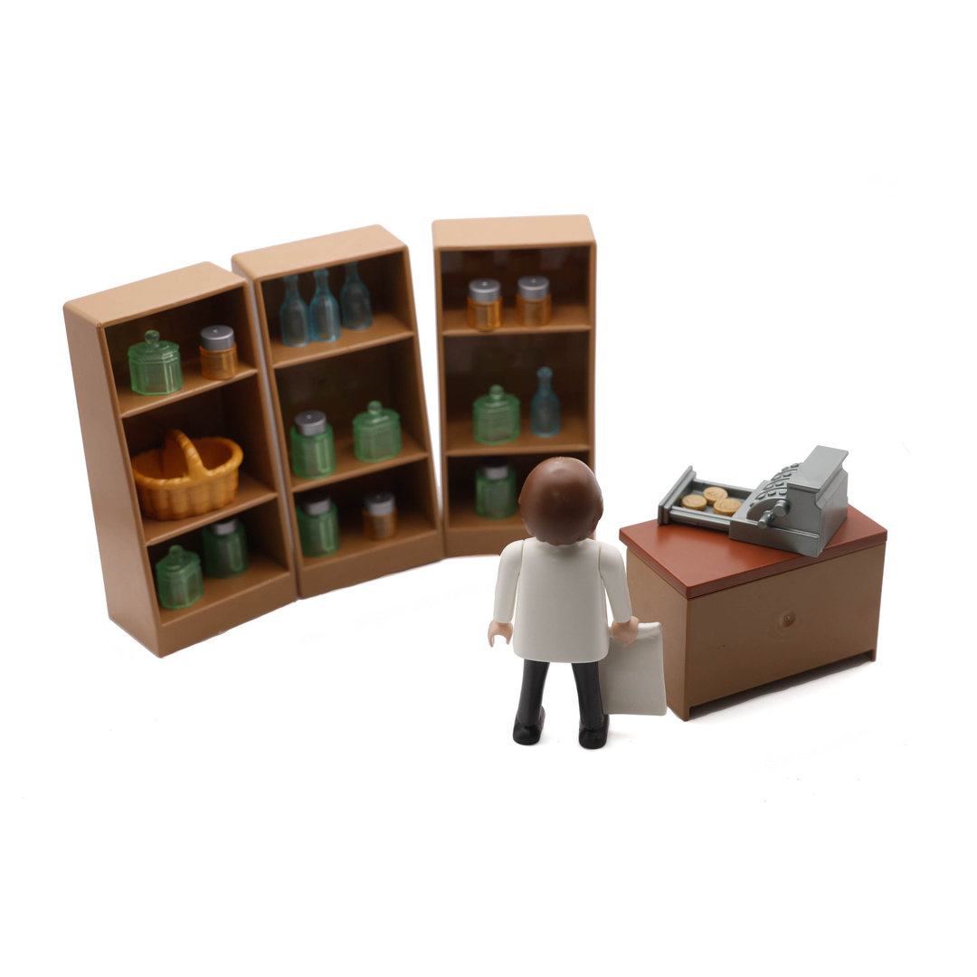 Playmobil Farmaceutico boticario con estanterias, frascos, botes, botellas, caja registrado y mostrador.