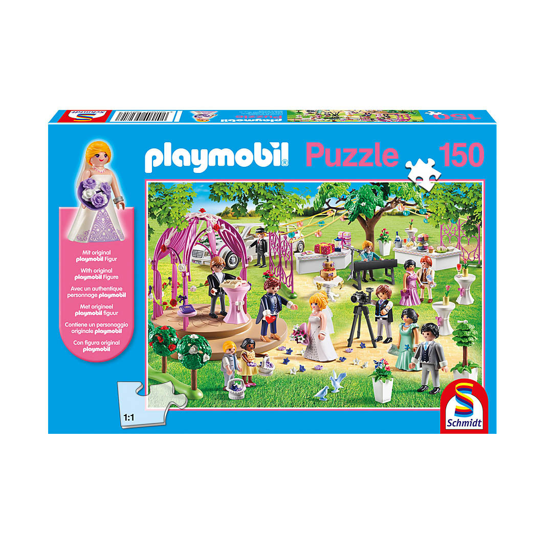 Schmidt 184704 Puzzle Boda Playmobil de la marca Schmidt de 150 piezas que incluye la figura original de novia de Playmobil.